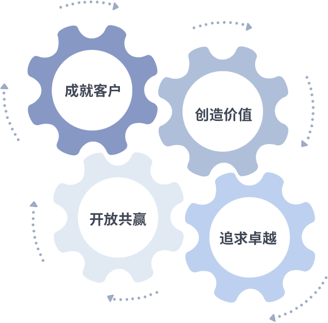 成就客户是一切决策的出发点,,,创造价值是衡量所有工作的标准,,,,追求卓越是我们做事做人的态度,,,开放共赢是我们的格局也是最终的结果。。。。价值观的齿轮环环相扣,,,推动着组织里的每个人不断向前。。