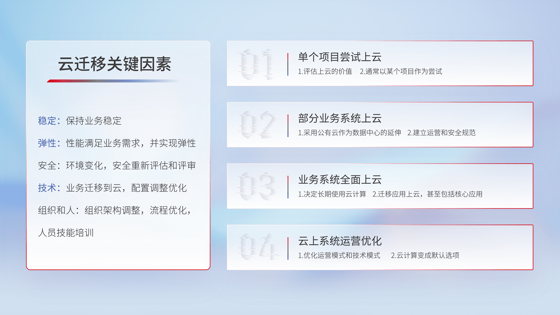 结合实际业务,,,,从规划设计、、、云平台选型、、、云原生改造、、、、数据迁移、、集成交付,,,,迁移全过程为客户识别最佳上云路径,,,,做好风险识别管理,,,设计网络架构、、、身份权限、、、安全审计合规、、操作审计、、、日志审计、、监控告警策略、、多站点容灾设计等,,,,对云上基础设施进行整体规划,,,,提升IT治理水平,,,以满足弹性、、高可用、、、、高性能的需求。。
