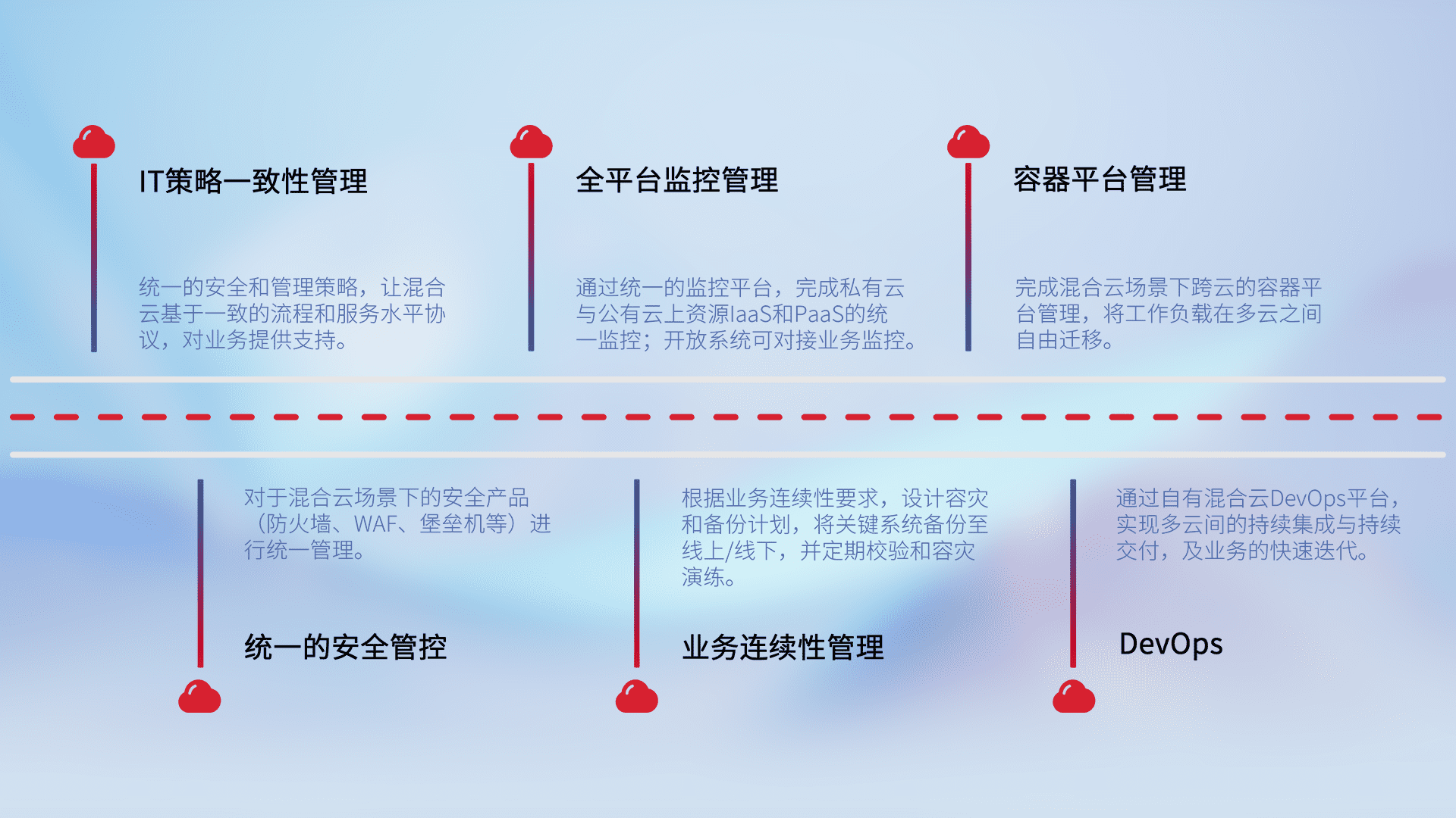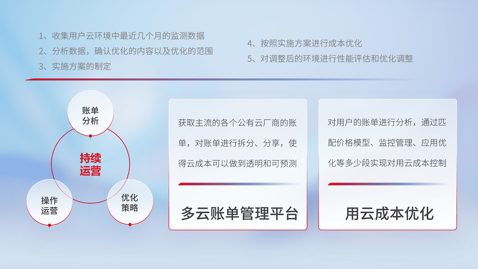 通过多云纳管,,,,以统一的资源数据模型把客户的云资源进行抽象和封装,,进而实现对多云资源的统一操作,,,保障云资源管理的可靠性、、、、稳定性与可用性。。量身定制化运维内容,,,,配置、、、开发运维、、、、补丁管理、、备份、、监控、、、认证和访问管理、、、审计和日常巡检等,,,保障在用云过程中的可靠度,,,稳定度以及高可用率。。